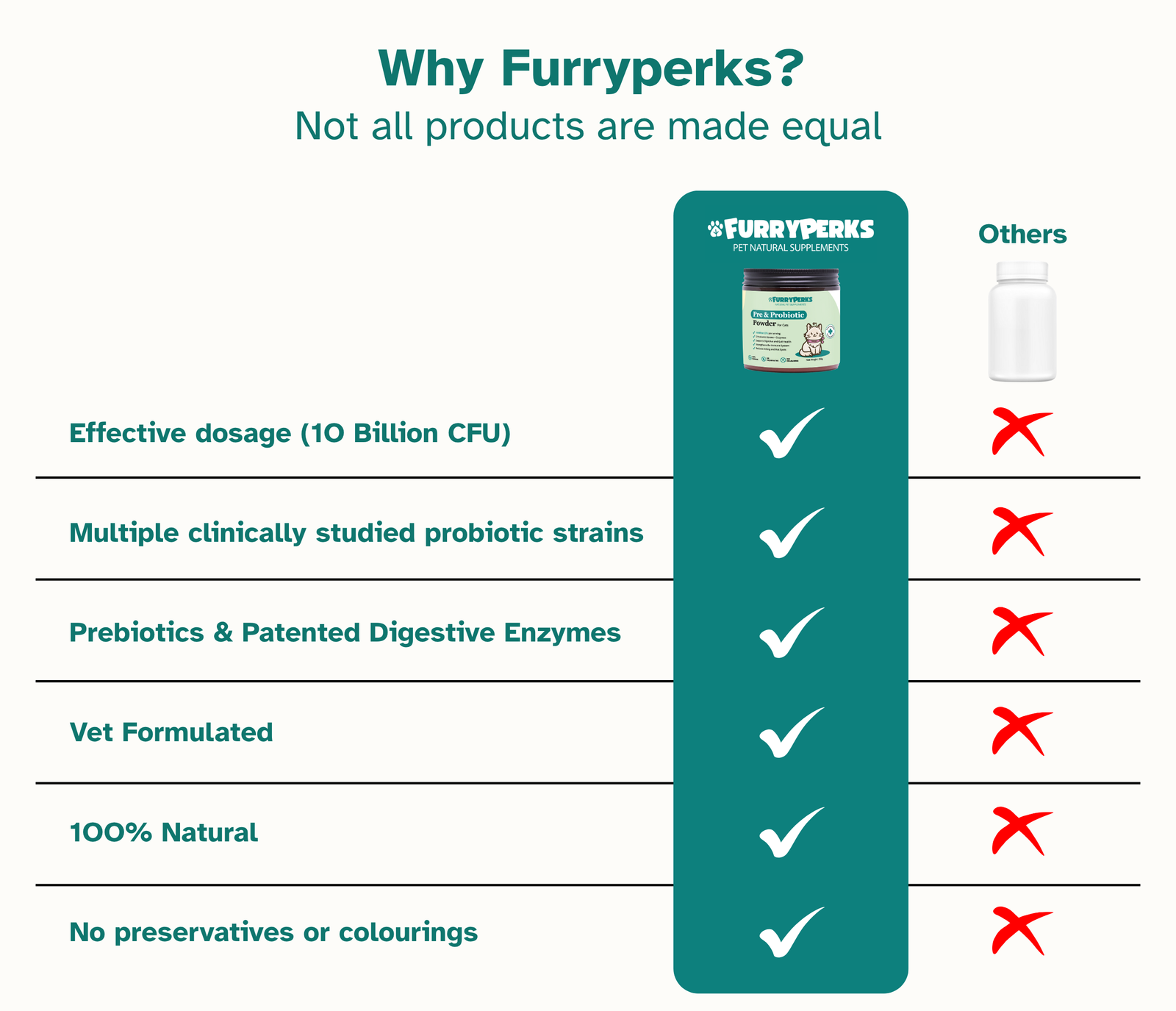 Our daily gut support formula for cats combines five clinically studied probiotic strains with prebiotics and digestive enzymes — designed to improve gut flora, boost immunity, and support overall well-being. Plus, it's tasteless and odourless, so even picky cats won't notice!